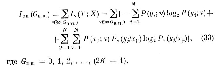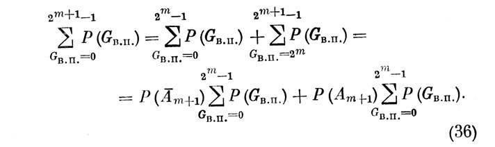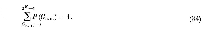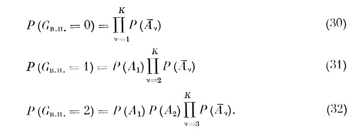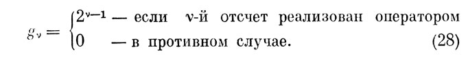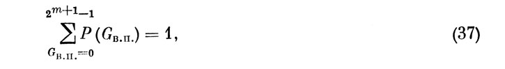 Основное достоинство введенного способа кодирования выявляется в результате представления любого Gв.п. из указанного выше промежутка в двоичной системе счисления. Действительно, двоичное выражение Gв.п. содержит К двоичных разрядов, причем номера разрядов справо налево совпадают с порядковыми номерами ЭО. Значащие цифры каждого разряда в соответствии с (28) и (29) указывают, реализован соответствующий ЭО или нет. Поскольку в рамках модели канала без памяти последовательные ЭО статистически независимы, то вероятность того или иного варианта реализации программы Р (Gв.п.) выражается произведением К сомножителей типа Р (Аν) или Р (Aν) в зависимости от того, содержат ли ν-й разряд двоичного выражения Gв.п. в качестве значащей цифры единицу или нуль. В соответствии с этим, например,