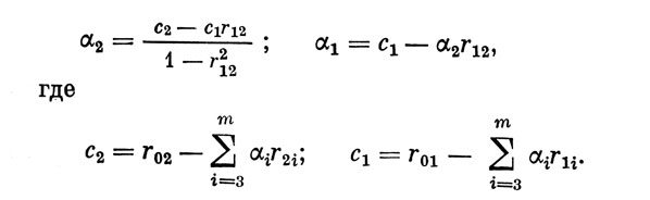 После окончательного отбора т признаков, для завершения формирования УМЛР (2) остается произвести расчет коэффициентов регрессии α1 α2, ..., αm. Классические формулы расчета, предложенные Г. Крамером [4], при m>3 становятся настолько сложными, что практически требуют применения ЭВМ. Однако, используя данные последовательно получаемых при методе "просеивания" корреляционных матриц, можно предложить более простую методику вычислений.