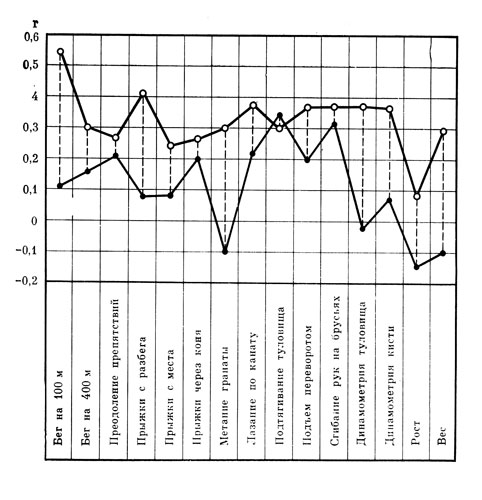 С целью выявления особенностей разброса характеристик "неслучайных" выборок, которые формально относят к одной и той же генеральной совокупности, нами был проведен следующий эксперимент. В трех аналогичных подразделениях одной системы спецобучения, каждое из которых состояло из 80-90 человек, все учащиеся были подвергнуты проверке по 15 признакам физического развития и физической подготовленности и между каждым из этих признаков и показателем общей успешности практического обучения, отдельно по подразделениям, были рассчитаны коэффициенты корреляции. На рисунке вертикальными отрезками прямых показаны крайние пределы изменения указанных коэффициентов корреляции для различных признаков. Оказалось, что наиболее резко отличающиеся коэффициенты корреляции отвечают в основном двум подразделениям - П1 и П3. Соответствующие значения соединены ломаной линией. Мы видим, что для подразделения П1 (верхняя линия) большая часть коэффициентов корреляции признаков с критерием успешности оказалась весьма высокой, достигая уровня 0,3-0,5, тогда как для подразделения П3 (нижняя линия) аналогичные коэффициенты корреляции - более низкие, иногда даже отрицательные (для подразделения П2 большинство коэффициентов корреляции имеет промежуточное значение). Мы не будем здесь касаться изменения коэффициентов корреляции причин этих различий, отметим лишь, что если бы система прогнозирования успешности практического обучения создавалась по результатам исследований одной из выборок П1 или П3, то эта система оказалась бы мало устойчивой, т. е. практически несостоятельной.