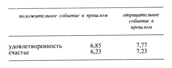 Еще одной базой для сравнения является собственное прошлое. Опрос, проведенный в ходе одного эксперимента, показал, что те, кто рос в бедности в годы "великой депрессии" (Экономический кризис 1929-1933 гг. - Прим. ред), склонны оценивать более поздние периоды своей жизни положительно (Elder, 1974). Таким образом, даже факт несчастливого детства может играть некую положительную роль. Экспериментальные данные подтверждают, что сравнения с прошлым могут воздействовать на суждения об удовлетворенности. В ходе одного эксперимента, проводимого в ФРГ, студенты должны были припомнить три самых положительных или отрицательных события в прошлом. Затем по специальной 11-балльной шкале они производили ранжирование своего настоящего уровня удовлетворенности и счастья. В результате получилось: