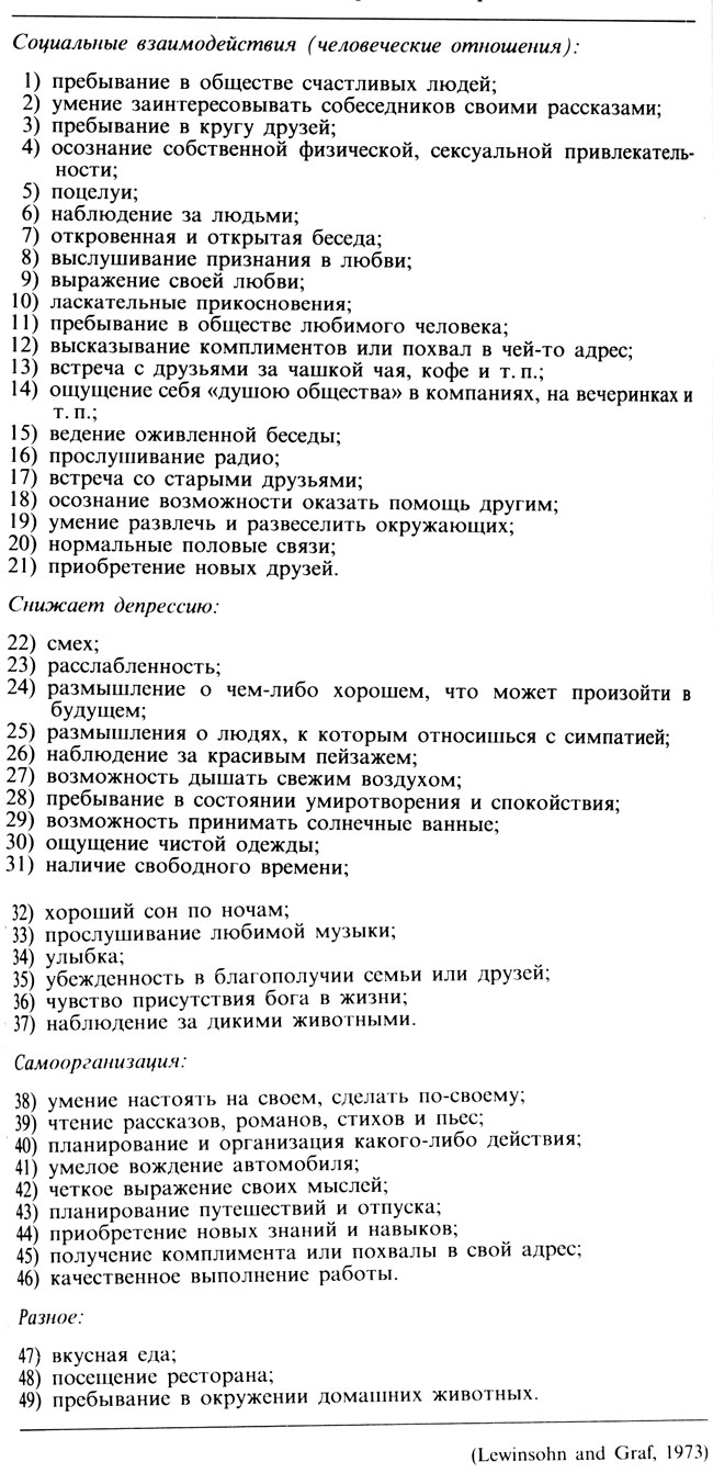 В то время как задачей психиатрии является устранение психических расстройств, нас интересует прежде всего повышение удовлетворенности жизнью и усиление положительных эмоций, которые в какой-то мере назависимы от недомоганий, расстройств и пр. К этому следует добавить, что имеется целый ряд существенных качественных различий в субъективных положительных состояниях: одни индивиды могут получать наибольшее удовлетворение от общения с друзьями, от музыки и от занятий спортом или от работы, другие же-от секса, употребления алкоголя, погони за деньгами и т. д. В круг задач психологов не входит поиск ответа на вопрос "Что же лучше?" или "У кого качество жизни выше?".
