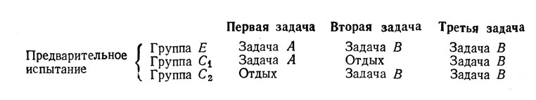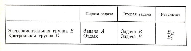 Чтобы компенсировать эффект включения в работу, можно предложить контрольной группе выполнить во время периода отдыха нейтральную задачу X, индифферентную по отношению к изучаемым переменным, то есть никак не связанную ни с задачей Л, ни с задачей В. В этом случае можно предполагать, что выполнение нейтральной задачи окажет на группу С действие, тождественное эффекту включения в работу, не вызвав, однако, при этом проактивных эффектов. Как подчеркивает Тьюн (1951), соблюсти эти условия очень трудно.