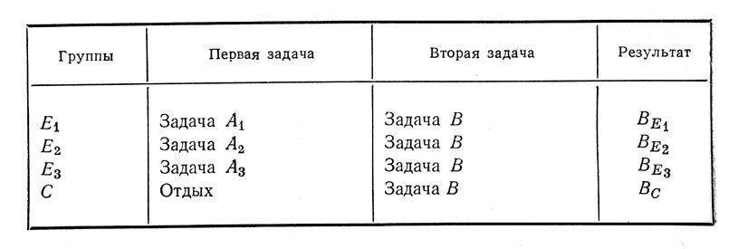 Такой план эксперимента позволяет изучить влияние задачи А в целом. Если же нас интересует роль какой-нибудь одной из переменных задачи А, необходимо составить столько экспериментальных групп, сколько существует вариантов изменения этой переменной.