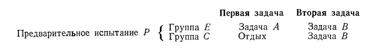 Задача Р, аналогичная задаче В, может, особенно если выполнение ее требует длительного времени, вызвать перенос. Можно, конечно, предположить, что, поскольку группы Е и С эквивалентны, проактивный эффект задачи Р проявится в них в одинаковой мере. Единственная сложность связана с тем, что в группе Е проактивный эффект задачи Р скажется сначала на выполнении задачи А, а затем задачи В; в группе С, напротив, влияние задачи Р отразится непосредственно на выполнении задачи В.