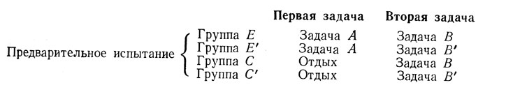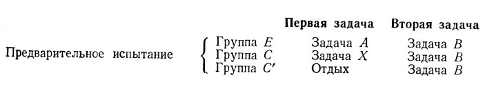 б) Реализация вышеописанного плана связана, однако, с двумя трудностями. 1) Прежде всего необходимо, чтобы экспериментальные и контрольная группы были эквивалентными в отношении способности выполнить задачу В. Чтобы преодолеть эту трудность, можно предложить испытуемым выполнить задачу, аналогичную задаче В, после чего разделить их на основании полученных результатов на две эквивалентные группы - Е и С.