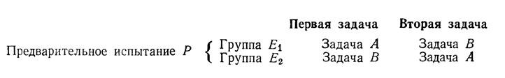 Эта довольно простая проблема возникает всякий раз, когда испытуемый должен последовательно выполнить две не связанные между собой задачи, и нас интересует при этом, какая из них наилучшим образом способствует выполнению последующей. Чтобы получить ответ на этот вопрос, достаточно осуществить такой план, предусматривающий уравновешивание экспериментальных ситуаций: