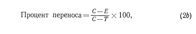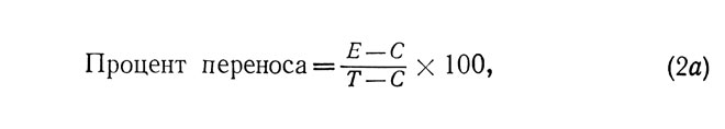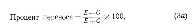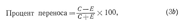 Эта формула, однако, не является вполне удовлетворительной, поскольку максимальное значение переноса в процентах, выраженное таким образом, будет стремиться к бесконечности, когда Е>С. Напротив, результат окажется равным нулю, когда эффективность деятельности обеих групп будет одинаковой: С=Е. Эта формула верна только в случае отрицательного переноса, эффект которого может меняться от 0 до -100%.