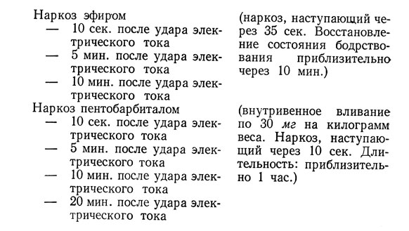 Через 24 часа после электрического удара крыс экспериментальных групп и контрольной группы А (не получавшей наркоза) помещали в клетку для исследования сохранения реакции избегания. Животных же контрольных групп Б и В через 24 часа после инъекции наркотика также помещали в клетку для исследования возможного действия наркоза на сохранение реакции нажатия на рычаг.