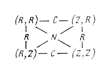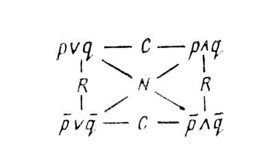 28. За конкретно-операциональными структурами, упомянутыми в п. 23, в возрасте 11-15 лет происходит построение двух новых структур, делающих возможной манипуляцию такими пропозициональными операциями, как импликация (p⊃q), несовместимость (p/q) и дизъюнкция (p∨q) и т. п. Такими новыми структурами являются "группа четырех" и комбинаторные операции. Комбинаторика на этой стадии состоит в классификации всех возможных классификаций (так же как перестановки являются сериацией сериации) аа, ab, ас, be, bb, се и т. п. и поэтому составляют не полностью новую операцию, но операцию над другими операциями. Сходным образом группа четырех INRC (Группа INRC - это группа операций, которые выполняются на операциях или элементах какой-либо другой алгебраической структуры и имеют инволютивную операцию (операцию, являющуюся своей собственной инверсией: N2=l). Примером инволютивной операции является закон двойственности (де Моргана) в булевой алгебре: p∨q=p∧q который мы можем записать: N(p∨q)=(p∧q) (N обозначает отрицание). Если мы определим С (коррелятивность) как правило, которое действует на отношениях, изменяя ∧ на ∨ и наоборот, и R (симметрию) как правило, которое действует по отношению к знакам истинности, меняя р на р и обратно, то, используя последовательно С и R (скажем, на (p∨q)), мы получим тот же результат, что и при использовании N. Следующая диаграмма иллюстрирует отношения между N, R и С, применяемыми в (p∨q):