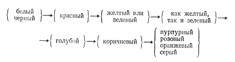 Эти авторы доказывают, что все языки имеют термины для черного и белого цветов, третьим обычно бывает красный, четвертым, если он существует, - желтый или зеленый и т. д. Они предполагают, что овладение названиями цветов у детей происходит в том же порядке.