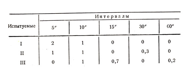 Такие же опыты были поставлены с другими 100 испытуемыми в возрасте от 17 до 36 лет, студентами университета. Им трижды предъявляли описанным методом два временных интервала в 5 и 3 секунды. В критическом опыте фигурировали два интервала равной длительности в 5 секунд.