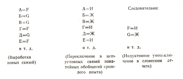 Можно, однако, спросить, не умозрительна ли такая интерпретация и каким способом можно ее доказать? Исследуя, экспериментально, 200 больных параноидной шизофренией, мы сосредоточили внимание прежде всего на создании модели индуктивного умозаключения, являющегося основным прототипом мыслительных операций. Для этой цели мы вырабатывали у больных сложные условно-условные (словесные) связи на несколько понятий, обобщающих группы словесных и зрительных образов, по формуле: