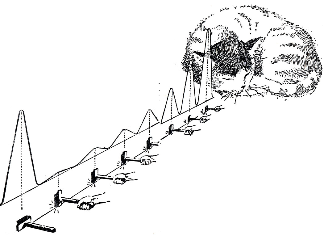 Это легко понять, если допустить, что в мозгу кошки есть механизм, прогнозирующий ближайшее будущее. Принцип его действия не так уж сложен. Прогнозируется именно то, что происходит в данный момент. Что повторяется, то и ожидается. Тишина - прогнозируется тишина. Чем дольше она длится, тем уверенней прогнозируется. Щелчки - прогнозируются щелчки. Чем больше щелчков, тем вероятнее, что они будут продолжаться и дальше. Все труднее ожидать чего-нибудь нового...